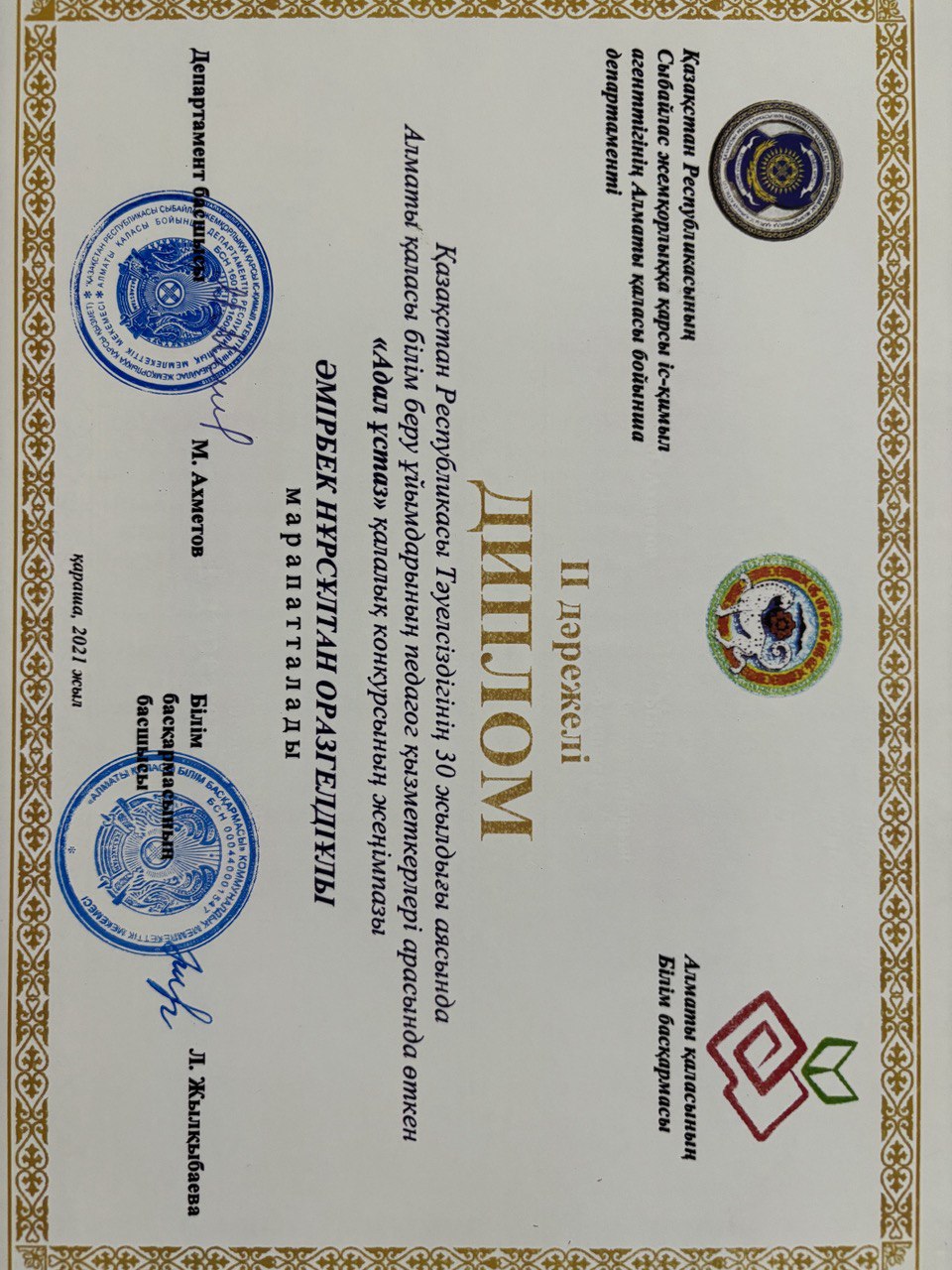 Алматы қалалық «Адал ұстаз 2021» байқауы(II дәрежелі) және